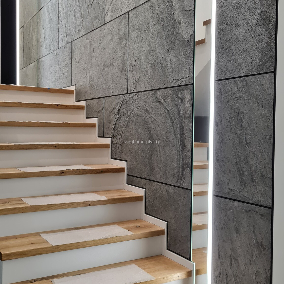 Klej rozprowadzić pacą zębatą na ścianie lub kamieniu od tylnej strony żywicy. Ściana nie musi być idealnie równa. Nierówności zostaną wypełnione klejem. Dociskać do ściany wałkiem do tapet. Szczelin w pomieszczeniach suchych jak salon czy sypialnia nie trzeba wypełniać i fugować. W łazience, strefach mokrych czy prysznicach szczeliny wypełnić silikonem. Narożniki zewnętrzne czy to w strefach suchych czy mokrych również zabezpieczyć silikonem. W pomieszczeniach mokrych i prysznicach warto zaimpregnować żeby zabezpieczyć materiał przed wodą czy tłuszczem.